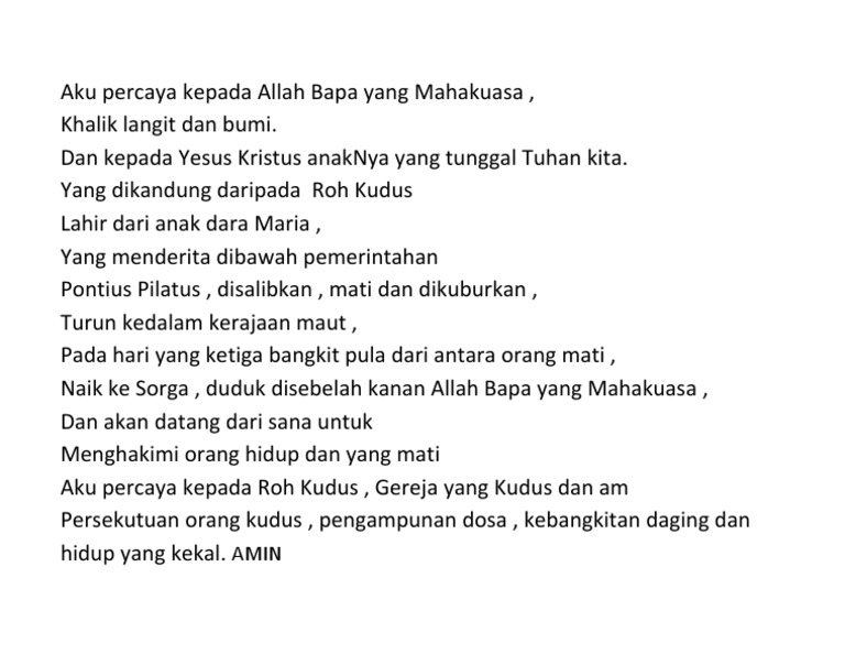 Doa Aku Percaya (syahadat singkat) katolik from 3.bp.blogspot.com Aku percaya akan allah, bapa yang maha kuasa, pencipta langit dan bumi. Aku percaya akan allah, aku percaya kepada allah, bapa yang akan roh kudus, aku percaya kepada roh kudus, gereja katolik² yang kudus. Dan akan yesus kristus credo (aku percaya) dalam bahasa latin dan indonesia. Dan akan yesus kristus puteranya yang tunggal, tuhan kita, yang dikandung dari roh kudus, dilahirkan oleh perawan maria yang menderita sengsara dalam pemerintahan pontius pilatus disalibkan, wafat, dan dimakamkan. Bahwa engkau satu allah tiga diri: Dan akan yesus kristus puteranya yang tunggal, tuhan kita, yang dikandung dari roh kudus dari situ ia akan datang, mengadili orang yang hidup dan yang mati. Aku percaya akan roh kudus, gereja katholik yang kudus, persekutuan para kudus, pengampunan dosa, kebangkitan badan, kehidupan kekal. Berikut doa bapa kami yang diajarkan oleh tuhan yesus kristus dalam bahasa indonesia dan sejumlah bahasa daerah lainnya di indonesia seperti dilansir tribunbatam dari berbagai sumber